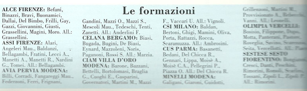 La squadra, il suo bravissimo allenatore Enzo Vignoli ed il capace Presidente Franco Lanzi vennero additati all'ammirazione di tutti. Ecco la formazione della squadra neo-campione d'Italia: Bortolamasi, Forghieri, Gasparini (cap.), Braglia, Governatori, Rigoni, Vaccari, Bonacini, Bertesi.