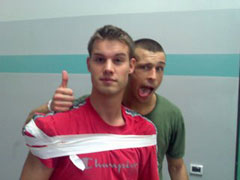 durante la cena del mio compleanno l'anno scorso gli animi si erano surriscaldati per la mole di alcool consumata ed era in corso una guerra di lancio schifezze… (vedi birra, torte e affettati vari...). Nel tentativo di lavarlo con la birra mi è scappata di mano una caraffa da un litro di vetro che si è schiantata contro il muro a 20 cm dalla sua testa… fortunatamente l'ho mancato…