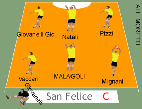 | Se lo scorso anno è stato deludente (se non altro rispetto agli ultimi campionati vissuti da protagonisti), quest’anno sarà ancora più dura. Non vorrei ripetermi, ma il girone è difficile (più lo scrivo e più me ne convinco!). La squadra è rimasta la stessa, con la defezione di Bergamini nel ruolo di banda. Quindi accanto alla diagonale Giovanelli-Mignani, dovrebbero trovare spazio Pizzi e Vaccari, con Malagoli e Natali al centro e Giu. Giovanelli libero. A parte gli arrivi di Baldini (centrale da Mirandola) e Stocchetti (banda dalla Daytona) è la stessa squadra: potente e incisiva nel gioco di palla alta (non spinta…) ed in battuta, con qualche difettuccio al centro e in fase di ricezione. Determinante sarà anche il fattore campo: venire via da San Felice con tre punti è una missione quasi impossibile. |