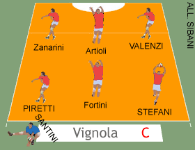 | Sarà una lotta durissima. Il girone B presenta almeno 4 squadre di livello assoluto. Anzi, 5. Vignola è una di esse. Se l’anno scorso la squadra vignolese ha ben figurato nonostante la lunga assenza di Zanarini (infortunio al legamento del ginocchio), quest’anno potrebbe fare sfracelli. Partiti Gollini e Reggiani, sono arrivati Piretti e, soprattutto, Valenzi. La potente banda ex-Correggio dovrebbe essere garanzia di quel salto di qualità da anni cercato. Il rientro di Zanarini (per il momento sostituito da Mincione), la conferma di una delle migliori coppie di centrali presenti sulla piazza (Artioli-Fortini), Stefani in cabina di regia e l’arrivo di una certezza come Sibani alla conduzione tecnica, faranno partire Vignola con tutti i favori del pronostico. Attacco di palla alta e veloce, muro e battuta. Da verificare la tenuta in ricezione, con il peso che graviterà sulle spalle di Piretti e del libero Santini |