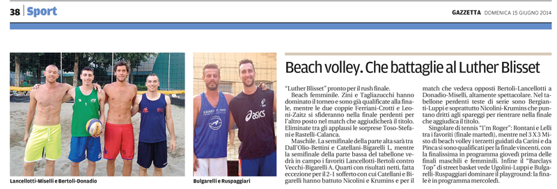 | BEACH TABELLONE MASCHILE: dal 3 al 19 giugno (iscr. 20€/persona) BEACH TABELLONE FEMMINILE: 4-5-10-12-19 giugno (iscr. 20€/persona) BEACH TABELLONE MISTO: 6-11-16-17-19 giugno (iscr. 60€/squadra) TENNIS SINGOLO "I'M ROGER": 11-12-17 giugno (iscr. 10€/persona) TENNIS DOPPIO "LUTHER GARROS": 4-5-9 giugno (iscr. 10€/persona) BASKET "BARCLAY TOP": 10-11-12-16-17-18 giugno (iscr. 10€/persona) |