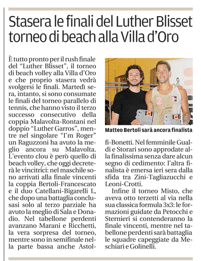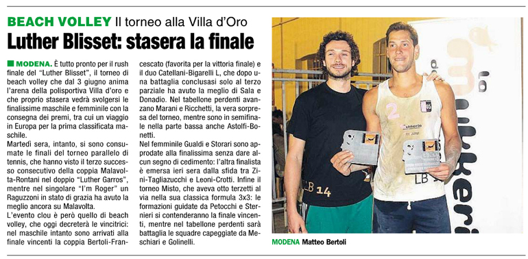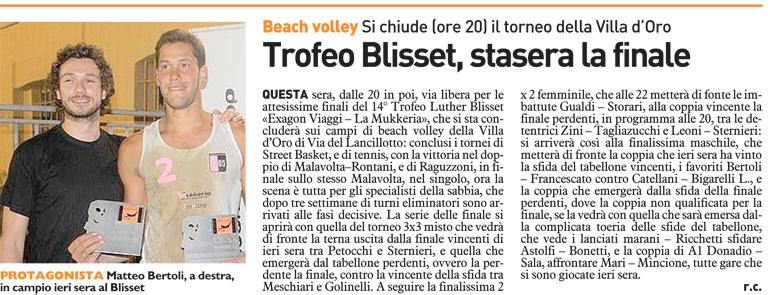 | D3 20.30: bertoli-francescato vs vecchi-nicolini 2-0 (15-12 15-11) | J1 21.00: mari-mincione vs camellini-sgarbi 1-0 (25-22) |